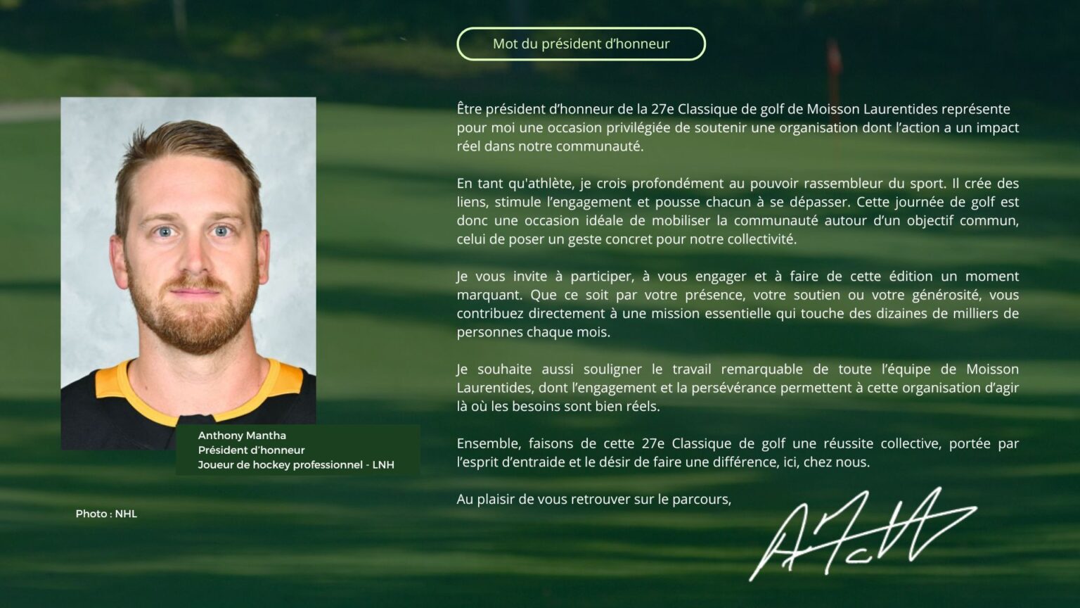 Cette édition se tiendra sous la présidence d’honneur d’Anthony Mantha, joueur de hockey professionnel, dont l’engagement contribue à mobiliser la communauté autour de la mission de Moisson Laurentides.